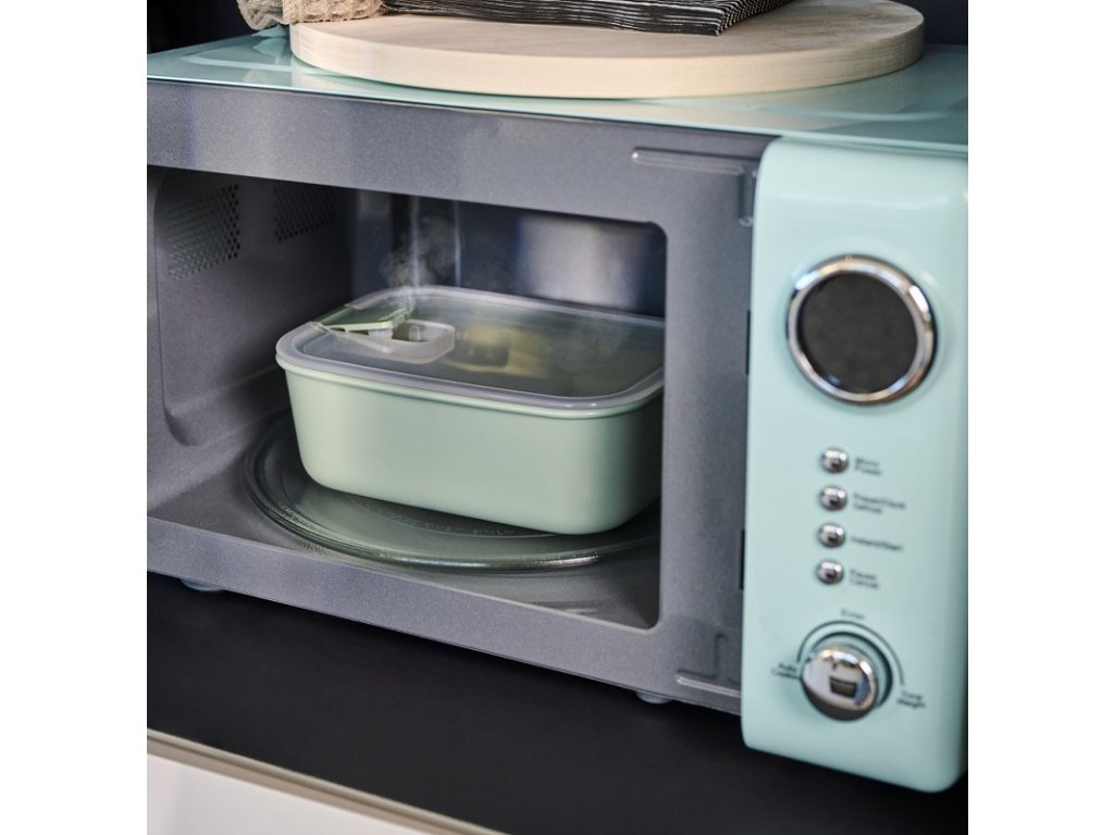 Úložný box včetně praktického víka je vhodný do mikrovlnné trouby. Stačí jen otevřít klip s jedinečným parním ventilem a za pár minut budete mít své jídlo z mrazničky nebo lednice na stole.